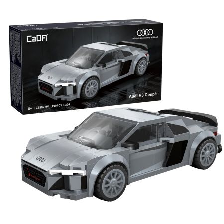 Officially licensed Audi R8 Coupe scale brick model with silver colour and printed pieces. A faithful 1:24 replica of Audi's mid-engined two-seater sports car that was in production from 2006 to 2024, it can manually move forwards and backwards and is ideal for play and display.
