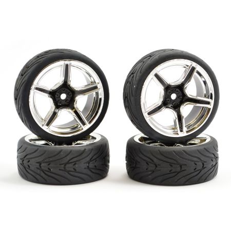 Fastrax 1:10 Street Wheel & Thread Tyres 5 Spoke Black/Chrome (FAST0095BC)