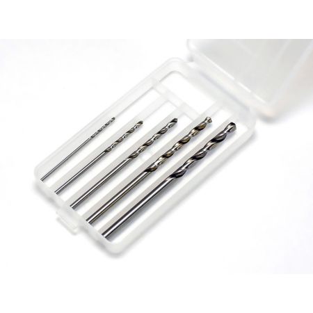 This is a 5-piece drill bit set used for various modeling applications. Combined with electric handy drills or precision pin vises they can be used to drill holes. The material on these drill bits are high-quality with a sharp cutting edge and provide long life.