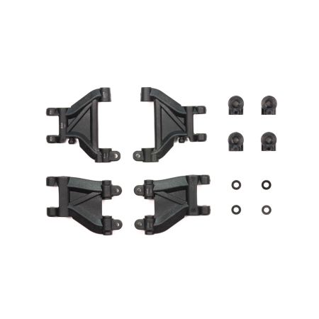 These are carbon fiber-reinforced nylon plastic D parts (suspension arms) for the M-07 chassis. They exhibit stiffer flex characteristics compared to the standard plastic parts found in the standard kit. These suspension arms are ideal to use under high grip surfaces.